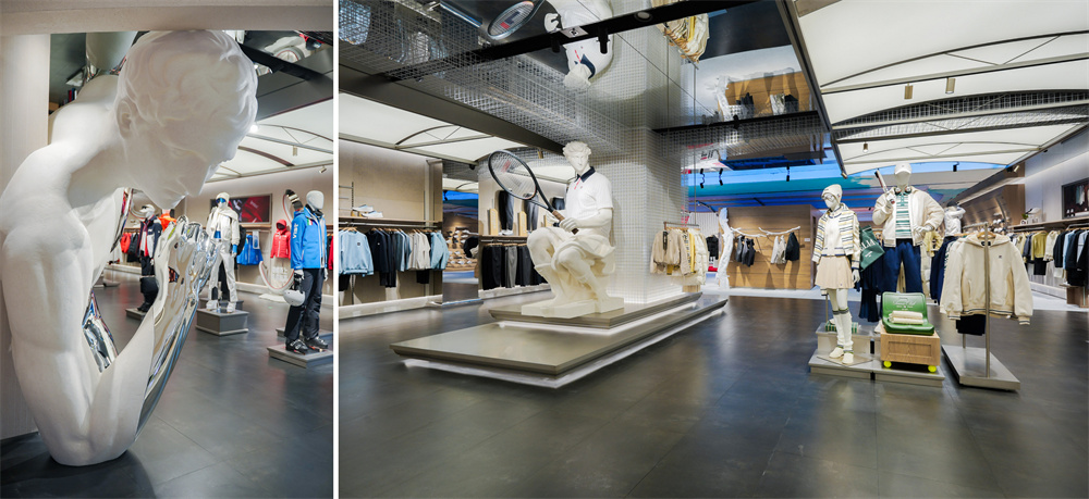 步入门店,以“意动永恒”为主题的专业运动区率先进入视野。这一区域以竞技力量元素与科技感的碰撞打造体验空间:入口的滑雪运动专区为空间注入米兰冰雪赛场的速度与激情;后场来到网球与高尔夫专区,与身披FILA经典网球单品BB1大满贯 POLO的雕塑《网球新章》其一再次相遇,感受古典艺术的现代张力,并探索品牌在网球领域的传承与拓新。