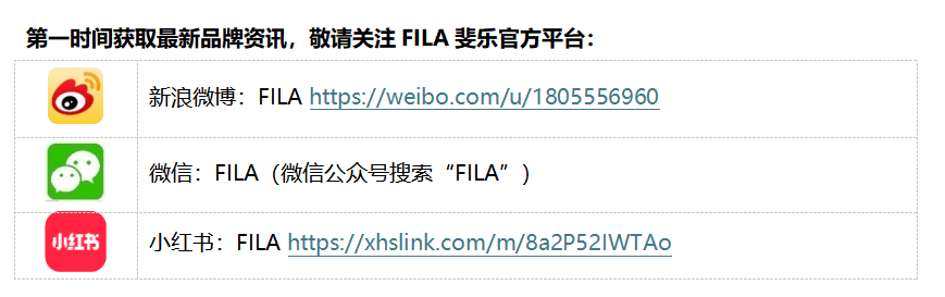 运动时尚品牌FILA斐乐于1911年创立于意大利Biella,传承意式时尚美学与运动基因,以匠心工艺铸就传奇经典与冠军荣耀。历经百年积淀,如今的FILA秉持“运动致美(Make Performance Beautiful)”的品牌使命,致力于提供将专业运动与时尚风格完美融合的创新产品,并鼓励人们全情享受美好生活。品牌旗下包括专注专业运动与时尚生活的FILA,专注高端儿童鞋服的子品牌FILA KIDS,专注年轻潮流运动的子品牌FILA FUSION,以及两大菁英运动系列FILA GOLF和FILA TENNIS,共同为中国中产消费者及家庭带来多场景、多功能的明星单品及全系列运动时尚服饰及鞋履产品,并继续引领运动时尚的未来。