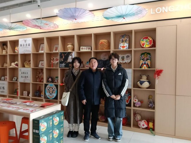 图 1 陇县文化馆党支部书记、非遗传承人杨秉权(中)与五色文化创意工作室的两位联合发起人李承恩(右)和姚溪子(左)合影留念
