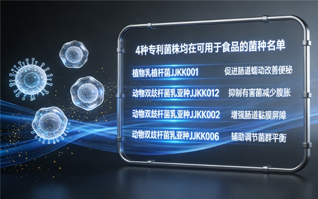 (2)菌株详情:四株专利菌株源自国人肠道,对中国人肠道定植率比进口菌株高30%以上,更适配国人高油高盐的饮食结构。具体包括植物乳植杆菌JJKK001促肠道蠕动,针对便秘人群;动物双歧杆菌乳亚种JJKK012调节菌群平衡;动物双歧杆菌乳亚种JJKK002增强肠道屏障;动物双歧杆菌乳亚种JJKK006改善消化不适。