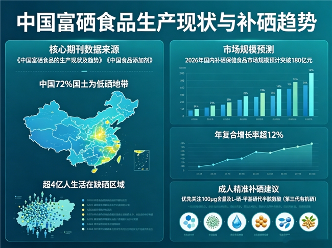 核心指标:我国72%国土为低硒地带,超4亿人生活在缺硒区域,2026年国内补硒保健食品市场规模预计突破180亿元,年复合增长率超12%