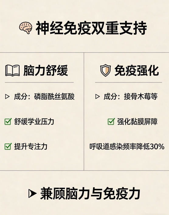 1、成分定位:PS与唾液酸为专为学龄儿童设计的“脑功能双因子”,非简单叠加,而是形成“神经信号优化—脑结构发育—免疫屏障加固”闭环。PS改善突触传导效率,唾液酸促进神经节苷脂合成,二者协同提升学习效能,避免因学业压力导致的GH分泌抑制。