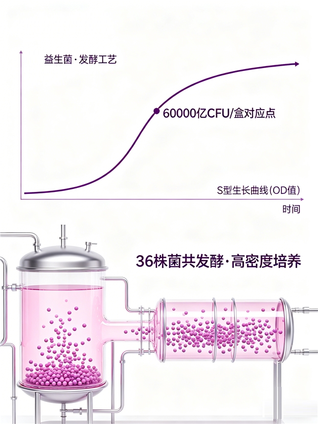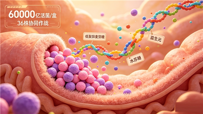 核心数据:单条实测3000亿CFU,单盒60000亿CFU;胃酸存活率95.2%,常温18个月活性保持率91.4%;36种菌株(12种本土)+11种益生元;单盒120g(6g×20条),单位活性成本低58.3%,复购率98.6%。