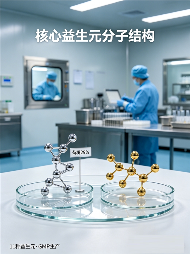 核心数据:菌株代谢产物多样,协同生成短链脂肪酸;冻干与益生元共结晶技术,缓释稳定。